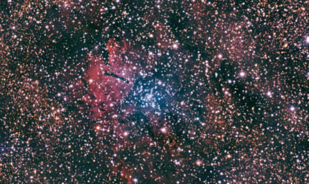 Der Cirrusnebel ist Teil eines riesigen Supernova-Überrestes, dessen Explosion vor rund 18.000 Jahren stattfand. Er leuchtet im roten Licht des Wasserstoffs und im grünen Sauerstoff-Licht. Das Foto zeigt einen helleren Ausschnitt der zahllosen Filamente und entstand mit 27 Minuten und 5 Sekunden Belichtungszeit bei 2,7 Meter Brennweite am großen Teleskop der Sternwarte Huchenfeld.